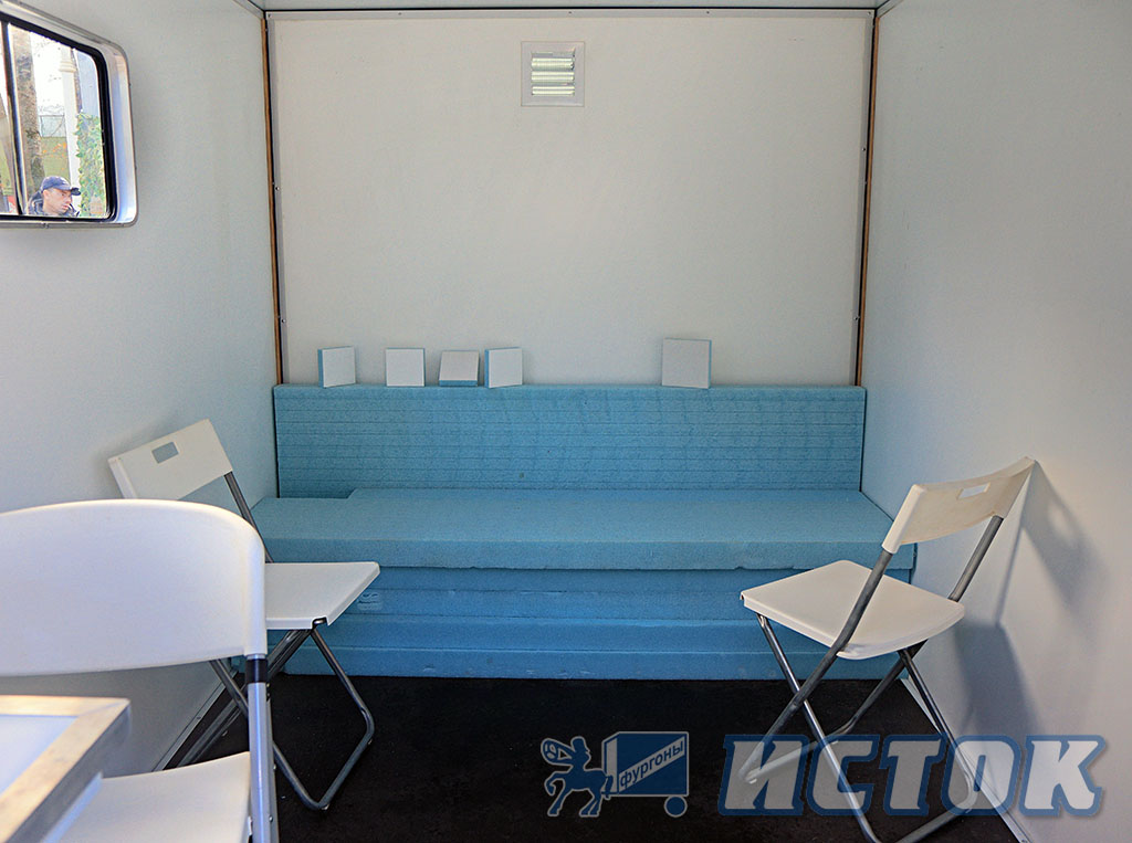 Также при формовке сэндвич-панелей в них уже заложены: дверь, окна, электроввод с розетками, вентиляция, откидной стол, вешалка, сегменты спальных мест и т. д. Сами же сэндвич-панели, которые являются полом, стенами и потолком изготавливаются методом вакуумной формовки на основе экструдированного пенополистирола и облицовки из пластика или металла.